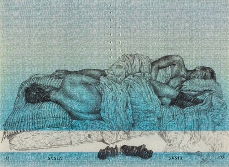 Isabel Rock was born in London in 1981 and received this prestigious biennial award on the basis of her proposal to develop a body of work that depicts an imaginative, surreal vision of the world after climate breakdown has wreaked its havoc. Her recent drawings have a strong narrative looking at systems of commerce, power structures, the complexities of desire, objects of value, the fallibility of human nature and the enterprising charm of human endeavour. Her drawing selected for the exhibition, Our Cell, is a biro drawing on paper offering a glimpse into her month-long stay in HMP Bronzefields in November 2022, when her participation in the Just Stop Oil protests to raise awareness of climate emergency led to her being arrested and incarcerated for a month in prison.