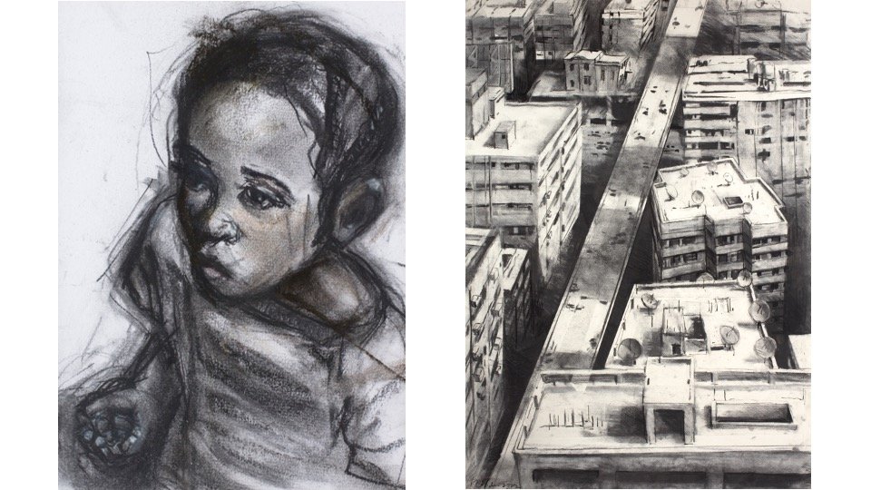 Student Award: Peter Blodau, El Kobri Maadi, 2023, charcoal on paper, 60 x 40cm (above right). Peter Blodau is currently studying MA in Illustration at Plymouth University of Art. His award-winning charcoal drawings, El Kobri Maadi, 2023, is of the dusty and multi-layered Cairo cityscape, dynamically captured from its rooftops. The black-and-white drawing presents a landscape of flat, barren, roofs with their own worlds of satellite dishes, left overs, and long forgotten items. "Using the medium of drawing, I work directly in front of the subject to express an immediate direct response”, Peter Blodau explains, “the play of light on these hard geometric forms endlessly varying yet always the same becomes another aspect I sought to capture in this series of works on paper."