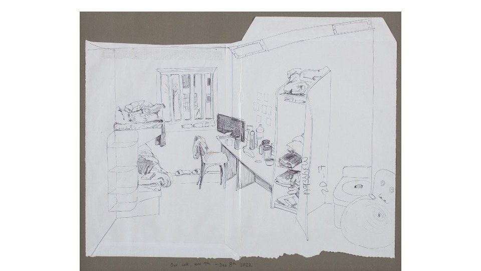 Isabel Rock explains, “As I have become more involved in civil disobedience the more I question our society, its rules and how we inhabit the environment. My month in Bronzefields prison showed me that I don't need all of the things I thought I needed. The experience highlighted the resilience of the human spirit, the ingenuity of necessity and the importance of human connection.” A key part of the artist’s usual practice, drawing became a way to document prison life, to make custody bearable, and to create meaningful connections. “Drawing in prison became my saviour against the monotony” shares Isabel Rock. “We received a notebook in our ‘welcome’ pack and when that was full, I drew on anything I could - envelopes, backs of crossword puzzles, scraps of paper.”