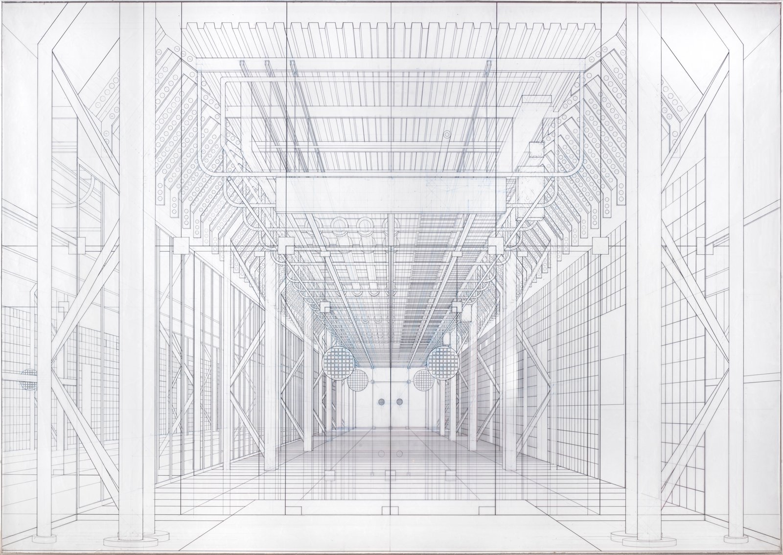The Working Drawing Award of £2,000 was awarded to Ade Olaosebikan (born in Lagos, Nigeria in 1991), for Reconstituted planes - The Barcelona Pavilion reimagined 1 and 2, 2023, a digital drawing, 59 x 42cm, and a drawing made with a technical pencil on tracing paper, 84 x 59cm.