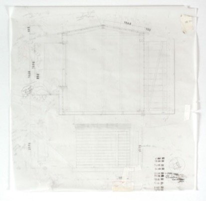 George Gibbs, Shed for Carolyn - Offset Section & North Elevation (1:10 and 1:20), 2022, pencil, ink and Conté Paris on architectural tracing paper, 42 x 42cm (above right)